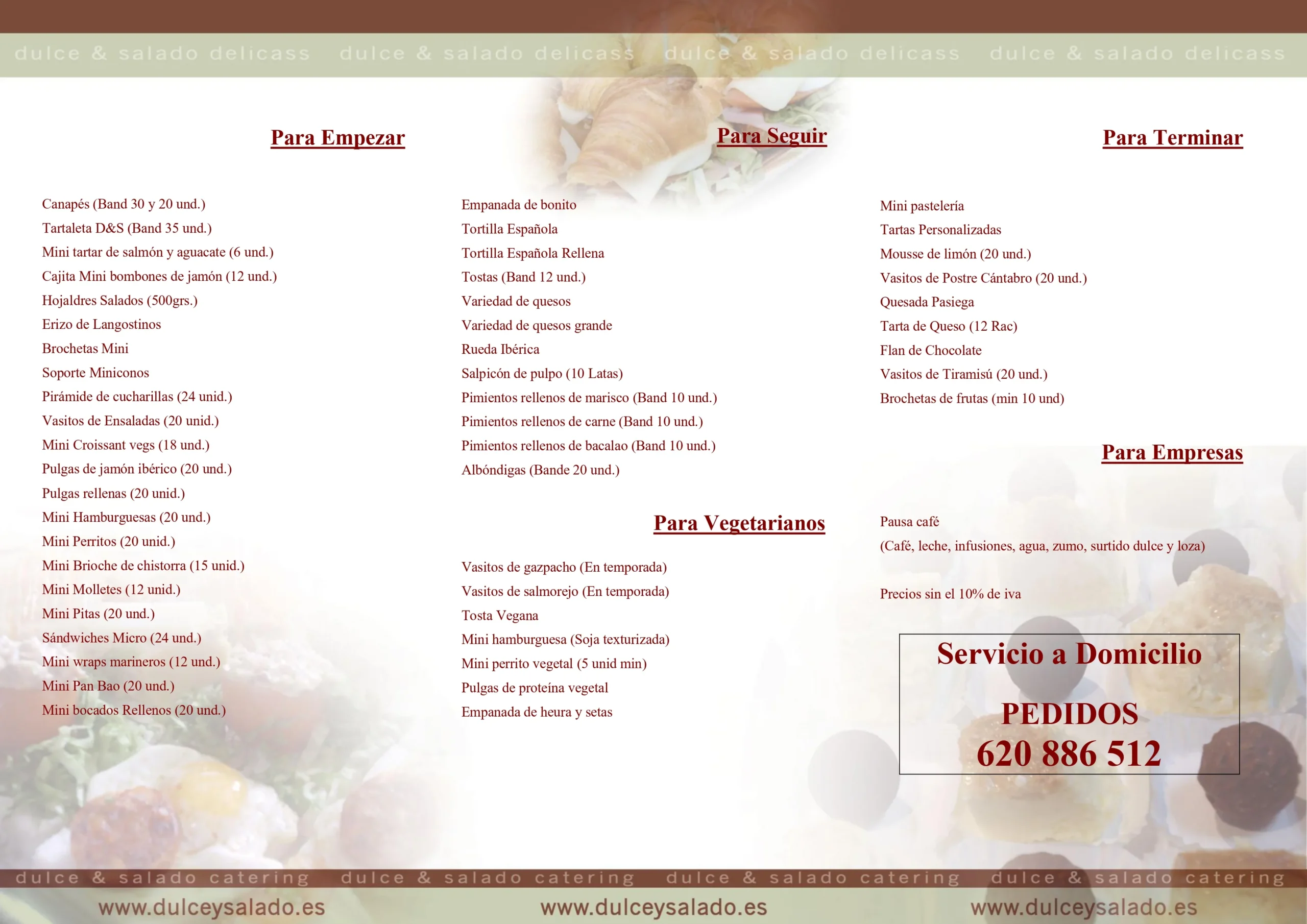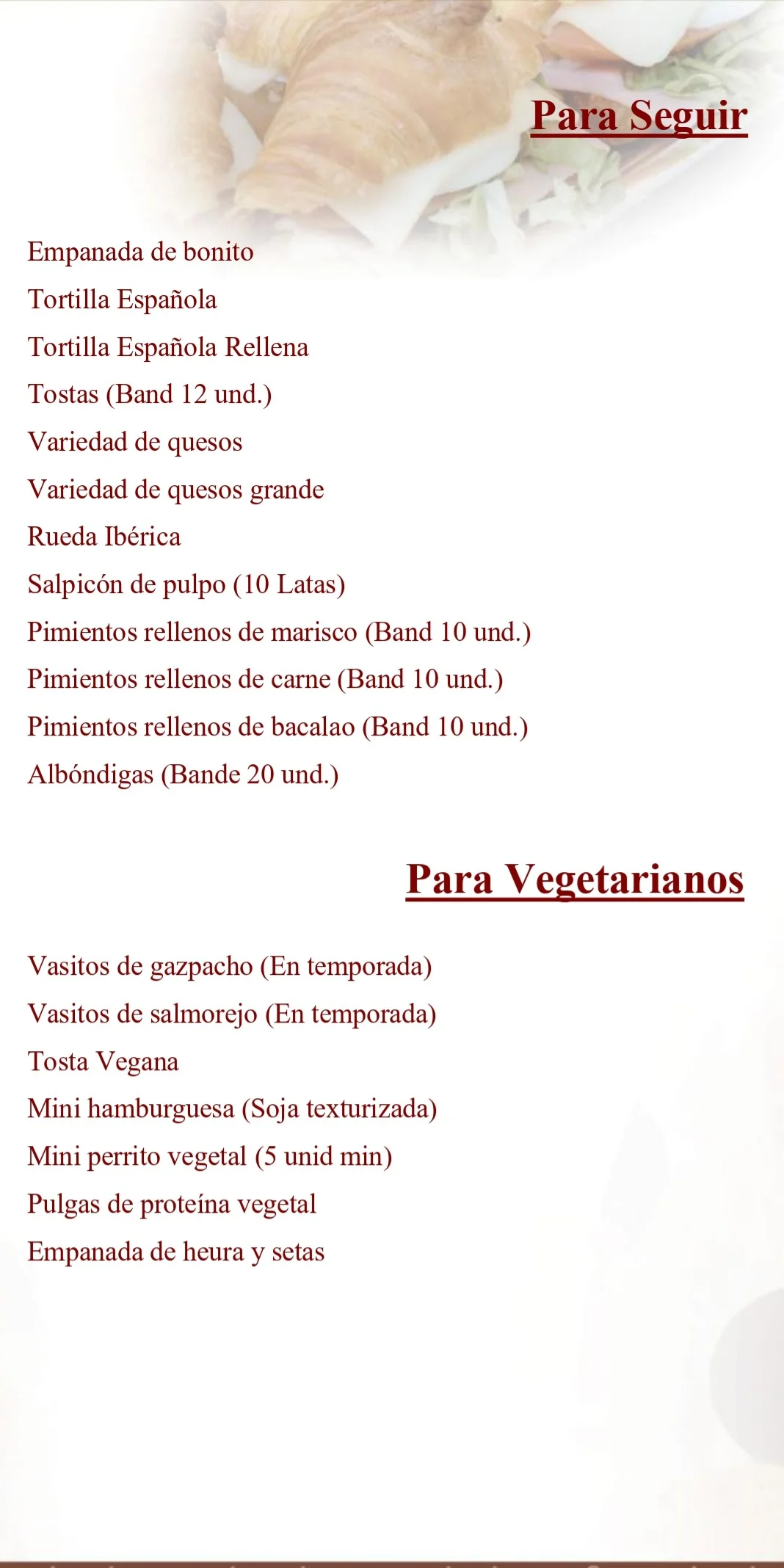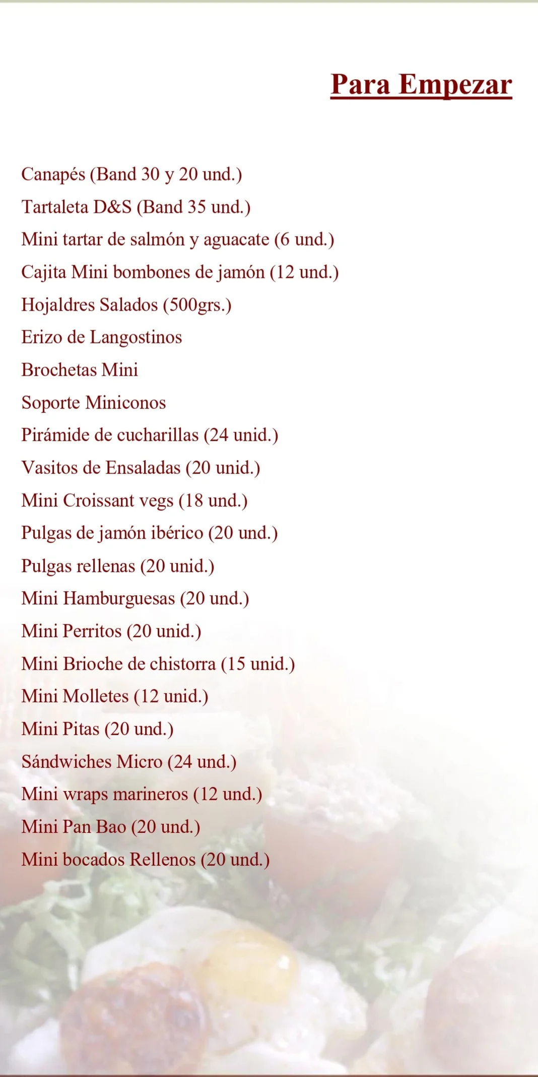 Explora nuestras propuestas saladas y dulces: canapés, hojaldres, tartaletas, mini hamburguesas, bombones de jamón, quesos y postres individuales.